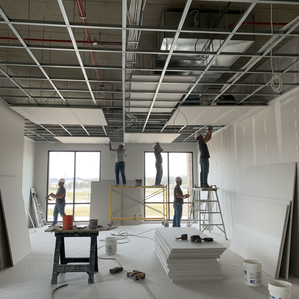 - Framework Setup: A sturdy grid system is installed below the main ceiling to support the drywall panels.